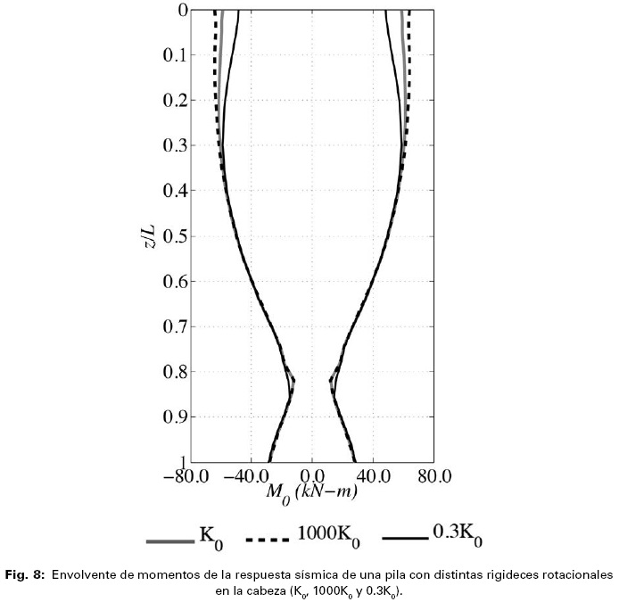 En la Fig. 8 se presenta también la envolvente de momento flexionante para la pila considerando una rigidez parcial de la conexión en la cabeza (%K0 =30). El valor del momento que se presenta en la cabeza es igual al momento calculado con la Ecuación 8.