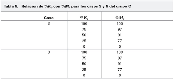 En las Tablas 7 y 8 se presenta una relación entre el momento en la cabeza de la pila, expresado como un porcentaje del momento bajo la condición de empotramiento perfecto (%M10), y la rigidez rotacional de la conexión, expresada como un porcentaje de la rigidez que produce un empotramiento perfecto (%K0) para dos casos de los g grupos A y C respectivamente. Es claro que la relación entre el momento desarrollado en la cabeza de la pila y la rigidez en la conexión no es lineal. Un punto a destacar es que esta relación es independiente tanto de la relación de esbeltez de la pila como del parámetro Vs/V0. Los resultados para los demás casos de los grupos A y C y para los grupos B, D y E, son exactamente los mismos y no se presentan por cuestión de espacio. Éstos resultados también se pueden consultar en el trabajo de Martínez (2011).