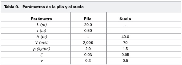 Para mostrar la aplicación de las ecuaciones definidas se lleva acabo el siguiente análisis. Se considera una pila de fricción desplantada en un medio homogéneo con un espesor H. Las características tanto de la pila como del suelo se presentan en la Tabla 9. Para el suelo se utilizaron propiedades representativas de las arcillas del Valle de México (Ovando, 1996). El acelerograma utilizado corresponde a un registro de pozo correspondiente a los depósitos profundos en un sitio clasificado en la zona III-b según el RCDF 2004 (Fig. 6). Los parámetros normalizados del sistema pila-suelo se presentan en la Tabla 10. Dados estos parámetros es posible estimar el valor К1re; específico para el sistema suelo pila presentado, utilizando las ecuaciones 5-6-7. Para el caso estudiado se tienen los resultados presentados en la Tabla 8.