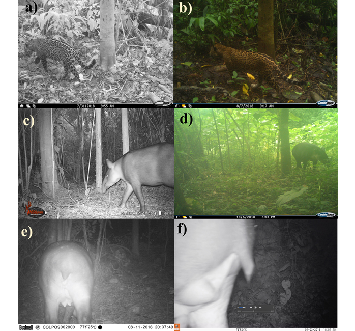 Figure 2 Photocaptures of specimens registered in the lower basin of the Uxpanapa valley, Veracruz. a) Adult jaguar “Individual 1” in an old forest fragment (Station 1). b) Adult jaguar “Individual 2” in an old forest fragment (Station 1). c) Adult tapir in an old forest fragment (Station 2). d) Adult tapir at day in a secondary forest fragment (Station 4). e) Adult tapir female (Station 4). f) Adult tapir male (Station 4).