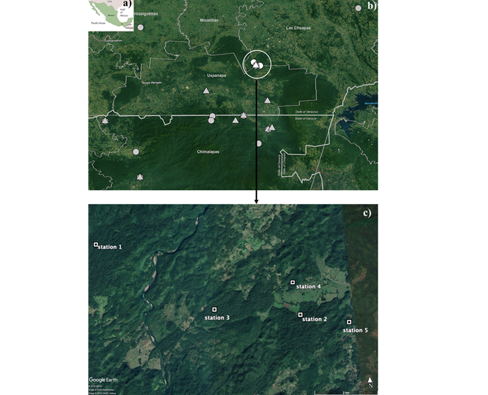 Sampling . We conducted two sampling seasons, the first from July to October 2018 and the second from December 2018 to April 2019. We set five camera stations with one camera trap each (Cuddeback®, Bushnell® and Wildgame®). Three stations were placed in two old growth forest fragments as followed: Station 1 (17° 22’ 23.38” N, -94° 13’ 48.25” W, 117 masl), placed in a 380 ha fragment of old growth forest surrounded by a > 10,000 ha large fragment of secondary forest; Station 2 (17° 20’ 56.05” N, -94° 10’ 1.90”W, 74 masl), placed in a 220 ha old-growth forest fragment surrounded by secondary forests and cattle pastures; and Station 3 (17° 21’ 06.37” N, -94° 11’ 35.98” W, 120 masl), placed in a 149 ha old-growth forest fragment surrounded by secondary forests and cattle pastures. Two more stations were placed in a 20-year secondary forests: Station 4 (17° 21’ 30.5“ N, -94° 10’ 06.3” W, 37 masl), placed in a forest fragment of 160 ha; and, Station 5 (17° 20’ 45.5” N, -94° 09’ 07.7” W, 68 masl), placed in a forest fragment of 166 ha (Figure 1c).