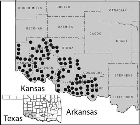 Figure 1 Map of 266 localities surveyed for D. elator in southwestern Oklahoma. Dots may represent more than one locality.