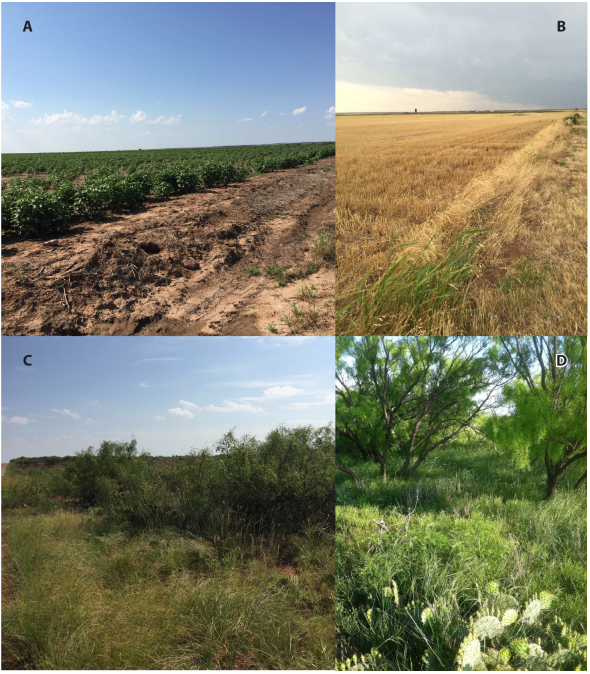 Figure 2 Examples of habitats surveyed for D. elator in southwestern Oklahoma. A) Cotton field. Oklahoma: Tillman Co.: 1 mi N, 6 mi W Chattanooga, 350 m (Photo taken 10 August 2017 by J. K. Braun). B) Harvested grain field. Oklahoma: Harmon Co: 3.25 mi S, 0.5 mi W Gould, 471 m (Photo taken 15 June 2017 by J. K. Braun). C) Mesquite grassland in late summer. Oklahoma: Tillman Co.: 4 mi N Loveland, 341 m (Photo taken 9 August 2017 by J. K. Braun). D) Mesquite grassland in early late spring. Oklahoma: Tillman Co.: 2.25 mi S Loveland, 260 m (Photo taken 4 May 2015 by J. K. Braun).
