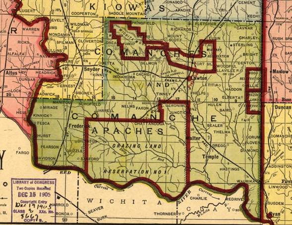 Figure 3 Map of the Big Pasture (labeled as Grazing Land Reservation No. 1) from the Library of Congress and published in The Daily Oklahoman in 1905.