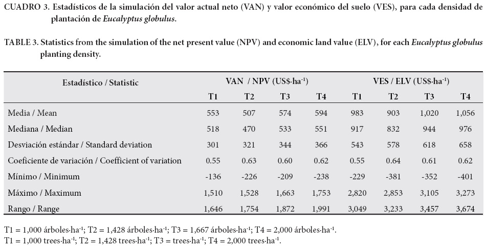 Después de 10,000 iteracciones, los valores de la media y mediana, para todos los tratamientos, fueron mayores que los resultados obtenidos por el cálculo de rentabilidad, lo que indica que los pronósticos son favorables para los supuestos de variación del precio y tasa de descuento. La distribución de los pronósticos es más homogénea al disminuir la densidad de plantación, tal como lo muestran la desviación estándar y el coeficiente de variación. Asimismo, el rango del VAN se reduce desde US$ 1,991·ha-1 hasta US$ 1,646·ha-1, en tanto que el VES lo hace desde US$ 3,674·ha-1 hasta US$ 3.049·ha-1. Esto nos permitiría seleccionar el T1 como el mejor tratamiento, toda vez que la desviación estándar sea menor; es la alternativa menos riesgosa ya que la probabilidad de obtener una rentabilidad negativa es inferior a los demás tratamientos. Los resultados son similares a los obtenidos por Kongsom y Munn (2003), quienes determinaron en plantaciones de E. camaldulensis que las densidades de plantación de 1,111 árboles·ha-1 mostraban desviaciones estándar menores que las densidades de 2,500 árboles·ha-1.
