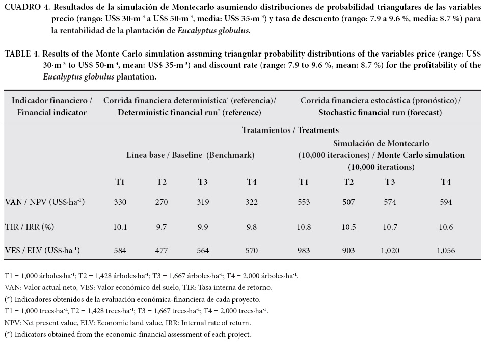 Kongsom y Munn (2003) utilizaron una distribución de probabilidad del tipo triangular para el precio de la madera pulpable y un rango de variación de la tasa de descuento de 5.6 a 11.6 %, para simular la rentabilidad de diferentes tratamientos de densidad de plantación en E. camaldulensis. Por otra parte, Hánninen, Mutanen, y Toppinen (2006) usaron una distribución del tipo log-normal para la variación del precio de la madera en Finlandia. En este estudio, para el precio de la madera pulpable, se aplicó un modelo de distribución estadístico de tipo triangular construido sobre la base de información de precios del mercado interno chileno del periodo 2005-2011. Los valores utilizados fueron US$ 30·m* como mínimo, US$ 50·m-3 como máximo, y un precio promedio de mercado de US$ 35·m-3.