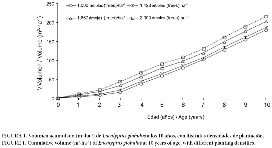 El aumento de la densidad trae consigo un aumento de volumen por unidad de superficie. Así, con el tratamiento de menor densidad de plantación (T1: 1,000 árboles·ha-1) se alcanzó un volumen de 183 m3·ha-1, mientras que con el tratamiento de mayor densidad (T4: 2,000 árboles·ha-1) se obtuvo el mayor volumen de 223 m3·ha-1. El aumento de la densidad también implica aumento de los costos, debido a que se requieren más plantas por unidad de superficie, así como la utilización de mayor cantidad de fertilizantes, herbicidas y mano de obra.