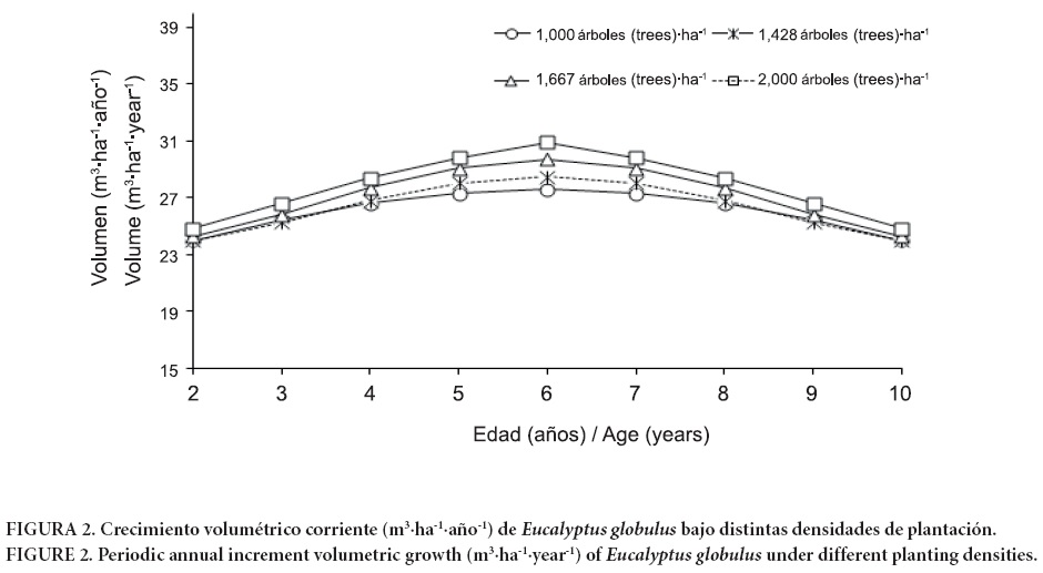 Geldres y Schlatter (2004) determinaron que el incremento medio anual (m3·ha-1·año-1) en E. globulus se maximiza a densidades entre los 1,271 y 1,508 árboles·ha-1. Para el caso de nuestro estudio, los incrementos en el volumen de producción en la plantación de 2,000 árboles·ha-1 fueron mayores que en el resto de las densidades evaludas. Lo anterior coincide con Jobet (1999), quien determinó que densidades superiores a los 2,000 árboles·ha-1 provocan un quiebre en la relación densidad-volumen. Sin embargo, estos valores no deben considerarse como máximos posibles, toda vez que para realizar tal afirmación habría que observar los resultados sobre un continuo de tamaños de densidad, el cual podría estar a un nivel menor o mayor de 2,000 árboles·ha-1.
