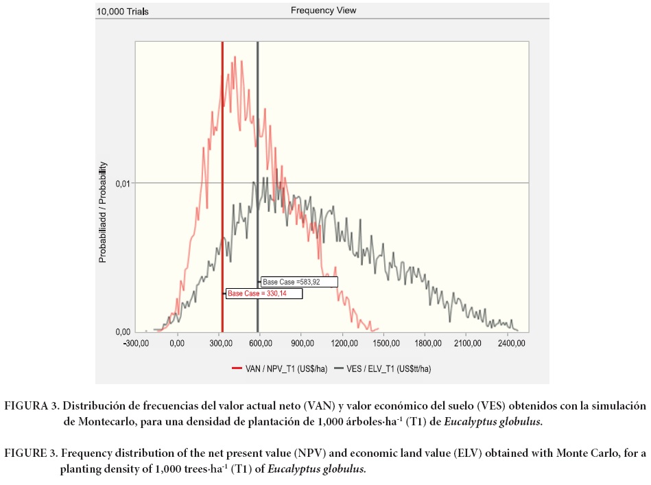 La probabilidad de ocurrencia del VAN obtenido con el T1 (US$ 330·ha-1) fue de 73.4 % y el VES (US$ 584·ha-1) de 73.5 %. La Figura 3 muestra la distribución de probabilidad de los pronósticos de VAN y VES del T1, después de 10,000 iteraciones.