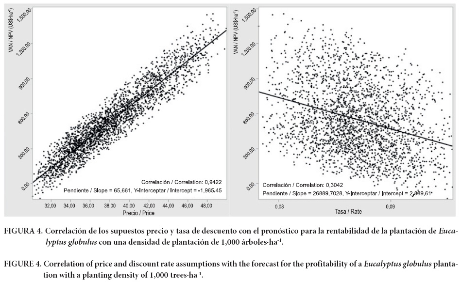En la Figura 4 se observa una correlación positiva de 0.94 del precio respecto del VAN. La Tc presenta una correlación negativa con el VAN mostrando valores en torno a -0.30. Whittock, Greaves, y Apiolaza (2004) coinciden en que el precio es uno de los factores que más afectan los pronósticos de rentabilidad, con correlaciones en el rango de 0.52 a 0.58, y para la Tc, correlaciones negativas que varían de -0.21 a -0.16.