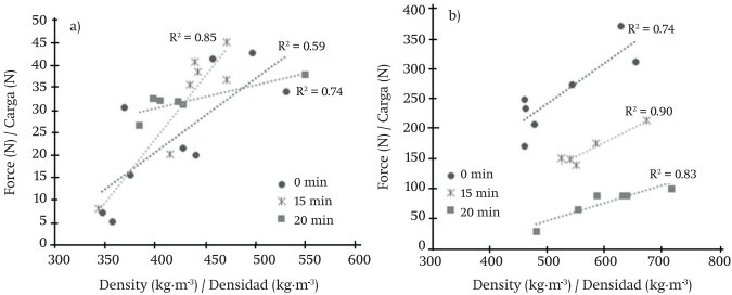 En la Figura 4 se observa que existe relación lineal entre la variable densidad de los pellets y carga de ruptura a la compresión. Para el caso de la especie G. arborea, el tratamiento sin torrefaccionar (testigo) presentó un coeficiente de determinación bajo de 0.59, seguido del de 20 min con 0.74; el coeficiente más alto fue de 0.85 en el tratamiento de 15 min. En D. panamensis se obtuvieron coeficientes de determinación de 0.74, 0.90 y 0.83 para los tratamientos de 0, 15 y 20 min, respectivamente. En ambas especies, la correlación más alta entre la densidad y la carga de ruptura del pellet se presentó en los tratamientos de 15 min. La relación positiva entre la resistencia a la compresión y la densidad de los pellets (Figura 4) de D. panamensis y G. arborea indica que cuando la densidad aumenta, la resistencia de compresión también incrementa (Carone, Pantaleo, & Pellerano, 2011), pero en el caso de que la variación de la densidad aumente, la resistencia a la compresión disminuye; es decir, la carga de ruptura que el pellet pueda soportar será menor.