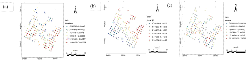 En este caso, la variable dependiente fue producción de conos y la variable independiente fue el diámetro de copa. El modelo GWR se procesó utilizando el software ArcGis 10.2.2; este análisis permite el mapeo de las estadísticas de los resultados y, por lo tanto, puede identificar el espacio geográfico específico donde la variable independiente tiene mayor influencia sobre la variable dependiente.