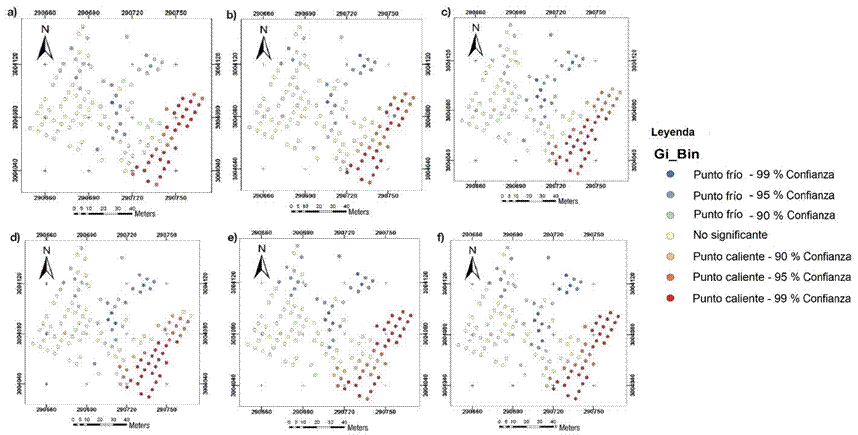 Figura 2 Puntos calientes o hotspots de las variables dasométricas de Pinus arizonica: diámetro a la base (a), diámetro a la altura de pecho (b), altura de copa (c), altura total (d), diámetro mayor de copa (e) y diámetro menor de copa (f).