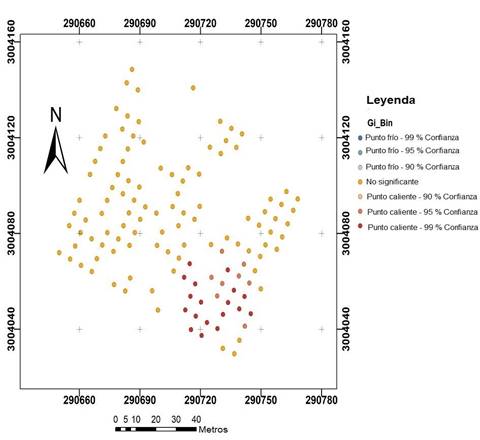 En este trabajo se demostró la capacidad del estadístico G para ayudar a comprender la distribución espacial de las variables dasométricas. El uso del estadístico G permitió concluir que tanto las variables dasométricas como la producción de conos se distribuyeron de forma no aleatoria con una tendencia a la agrupación, por lo cual se debe poner énfasis especial a las tasas altas de agrupamiento o hotspots (categorías 1, 2 y 3 con porcentajes de confiabilidad de 90, 95 y 99 %, respectivamente). El patrón espacial de dichas variables está influenciado por una o más variables físicoambientales e incluso antropogénicas; por lo tanto, la identificación del patrón de agrupamiento es estratégica para la toma de decisiones y análisis consecuentes, con el fin de determinar las variables causativas de la tendencia espacial. La agrupación ilustra la variación en las características dasométricas de árboles individuales dentro del huerto.