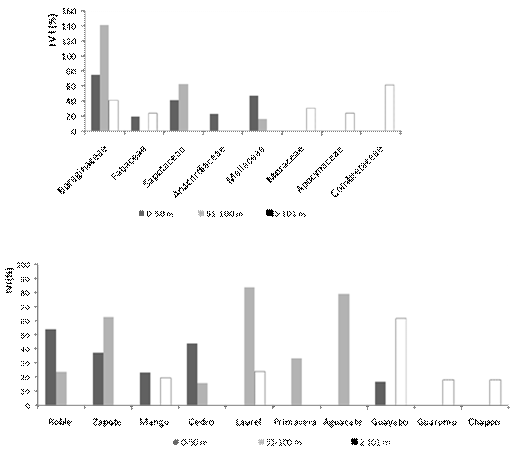 En cuanto al IVI, las familias Boraginaceae, Fabaceae, Sapotaceae y Meliaceae se encontraron entre las cinco más importantes, la cuales estuvieron representadas por especies localizadas en al menos dos de las alturas estudiadas. La familia Boraginaceae fue representada por especies de alto valor de importancia en los tres niveles altitudinales, lo que sugiere que se trata de taxones exitosos con especies capaces de desarrollarse en distintos ambientes y alturas (Figura 2). En contraste, la familia Fabaceae no estuvo representada con alguna especie de mayor IVI, pero si tuvo especies con menor IVI, tales como el zope (Schizolobium parahyba [Vell.] S. F. Blake) y chalum (Inga micheliana Harms), en dos niveles altitudinales.