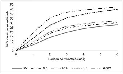 La riqueza estimada (Sest) se calculó mediante curvas suavizadas de acumulación de especies con el estimador no paramétrico Jacknife1 (Magurran & McGill, 2011; Moreno-Ortega, 2001). El análisis se realizó con el programa EstimateS v. 9.1 (Colwell, 2013).