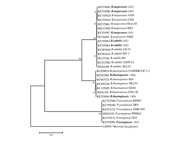 Figura 1 Árbol filogenético que utiliza las secuencias de nucleótidos del gen ARNr 16S de ocho cepas bacterianas (letras en negrita: Bacillus mojavensis, B. subtilis, B. thuringiensis y Pseudomonas aeruginosa) provenientes del suelo rizosférico de Jatropha curcas. *Borrelia burgdorferi (L40596) se incluyó como grupo externo. El árbol se construyó utilizando el método Neighbor-Joining con 1 000 réplicas de bootstrap. La barra de la escala indica el número de sustituciones por posición de nucleótidos.