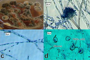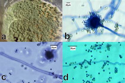 Figura 1 Características morfológicas macro y microscópicas de Aspergillus flavus aislado de suelo minero. a) Micelio, b) conidióforo, c) hifa y d) conidios.
