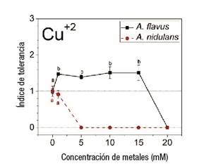 Figura 5 Comportamiento dosis-respuesta de Aspergillus flavus y A. nidulans. Índices de tolerancia con letras distintas denotan diferencias significativas (P < 0.01) entre concentraciones de metal (ANOVA de una vía con prueba post hoc de Scheffé y prueba no paramétrica de Kruskal-Wallis).