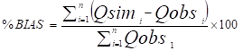 Este indicador se puede concebir como el promedio de los residuales de una fracción del caudal promedio (Ecuación 1). También es equivalente al error del volumen de flujo acumulado en relación con el volumen observado, el cual normalmente se conoce como error de balance hídrico en la literatura de modelación hidrológica. En general, valores bajos de % BIAS indican mejor eficiencia del modelo.