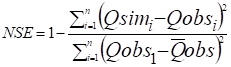Este coeficiente ha sido utilizado ampliamente por modeladores hidrológicos. El NSE puede ser considerado como el cociente de la raíz del error cuadrático medio para la varianza de los datos observados, sustraídos en la unidad. El valor de NSE varía de - ∞ a 1, siendo 1 el valor óptimo. Generalmente, entre 0 y 1 son considerados aceptables, mientras que valores < 0 indican que el promedio observado es mejor predictor que el simulado; lo que implica que la eficiencia del modelo es inaceptable.