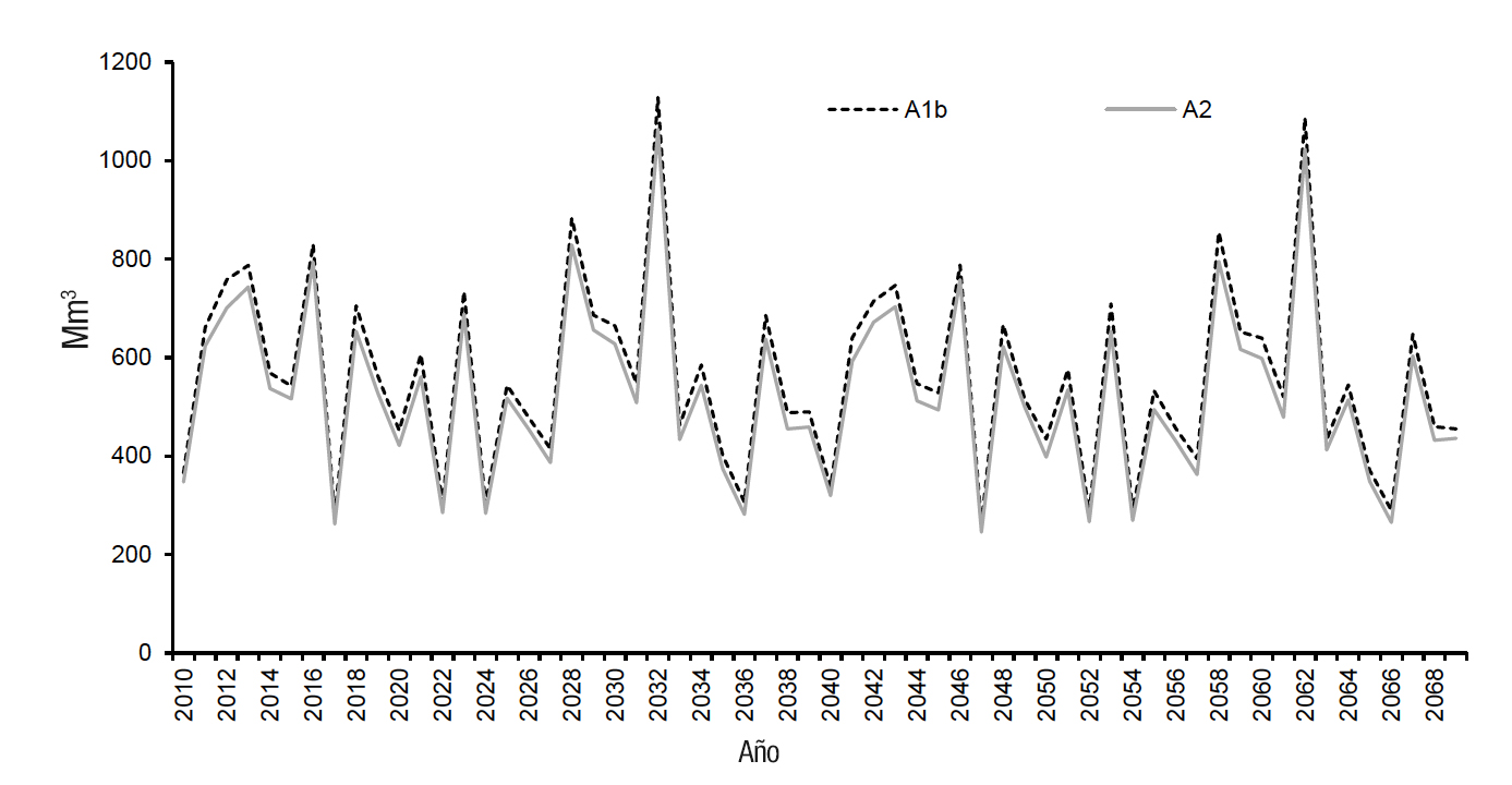 El escenario A1B, en el periodo 2020s, proyectó un incremento en el gasto medio anual de la cuenca de 9.6 %; mientras que para el A2 fue de 3 %. Lo anterior como efecto del posible aumento de las precipitaciones en las estaciones analizadas. En el segundo periodo analizado (2050s), el escenario A1B mostró 4.2 % más en el gasto promedio anual; sin embargo, el A2 reflejó una disminución de 3.3 %, considerando las precipitaciones obtenidas por el generador climático. Los valores históricos promedio observados para los escurrimientos en la cuenca fueron de 523.5 Mm3, por lo que, en términos generales, asumiendo un aumento en la PP, el modelo predijo el incremento en el escurrimiento para ambos escenarios.