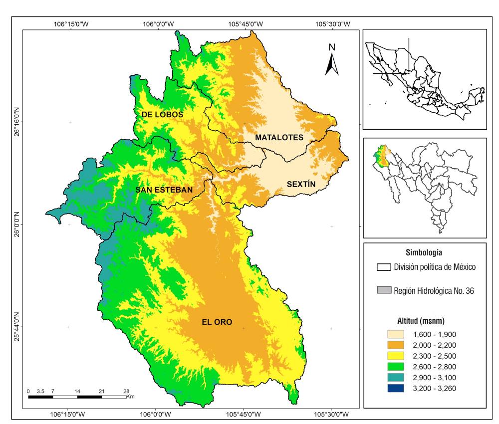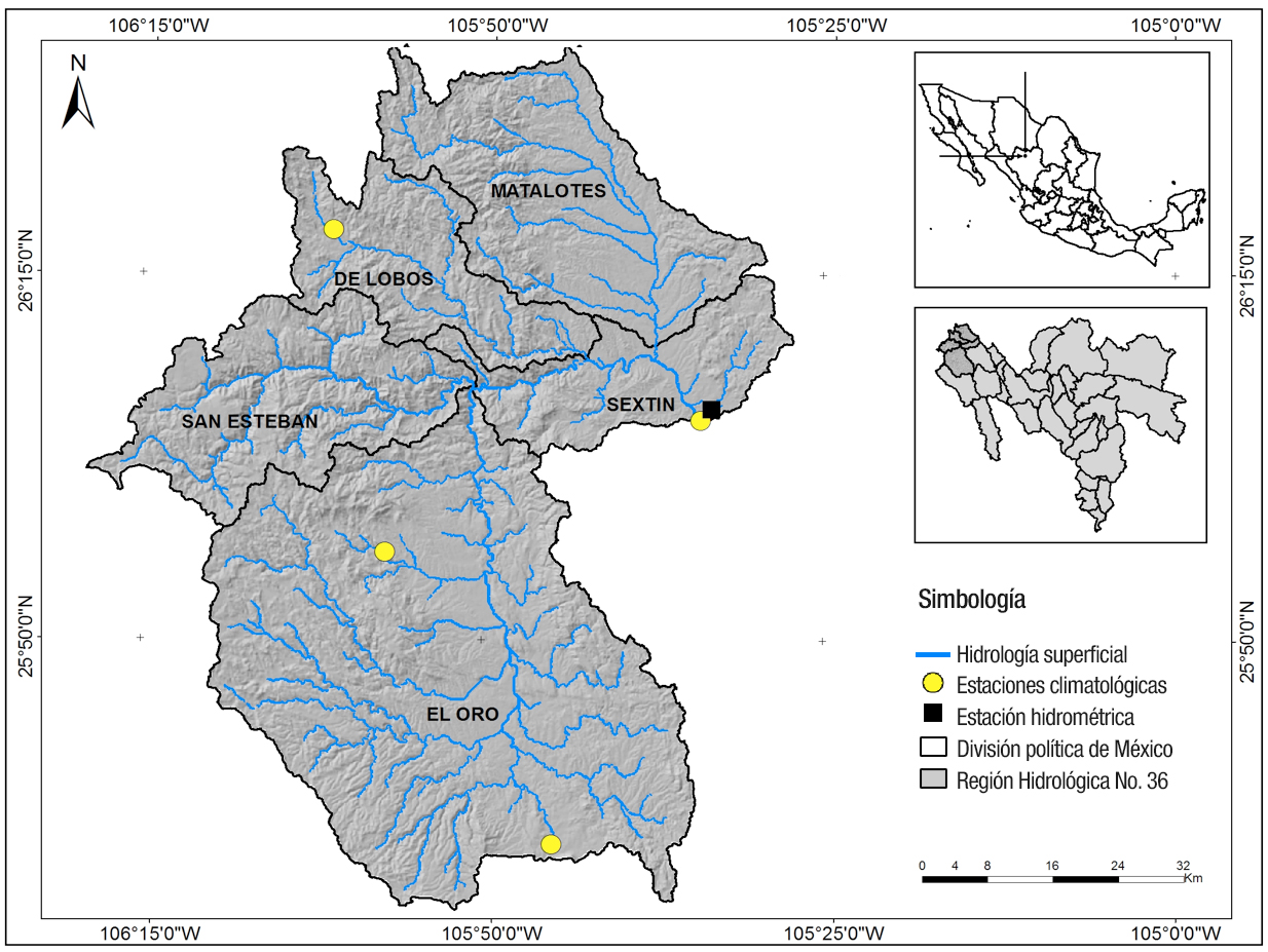 El gradiente altitudinal en la zona de estudio oscila entre 1,600 y 3,260 m, con pendiente media de 33 %. Específicamente, para la subcuenca Sextín se hizo una delimitación autónoma, debido a que la estación de aforo se encuentra en una zona intermedia y la superficie total no representaba el escurrimiento real en la zona de estudio (Figura 2). La estación hidrométrica utilizada para la delimitación de la cuenca corresponde a la estación Sardinas (clave 36071), localizada en el municipio de San Bernardo a 1,639 m de altitud (26° 5’ 3’’ latitud norte y 105° 33’ 57’’ longitud oeste; CONAGUA, 2016b).