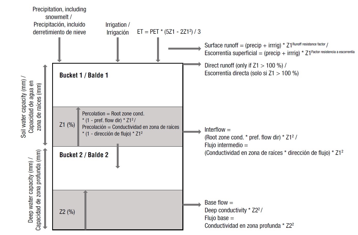Figura 3 Elementos hidrológicos modelados en el WEAP (Centro de Cambio Global [CCG], 2009). §ET: evapotranspiración, PET: evapotranspiración potencial, Z1: nivel de humedad inicial en zona de raíces, Z2: nivel de humedad inicial en zona profunda.