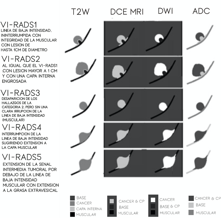 Tomado de: Panebianco V., Narumi Y., Altun E. Multiparametric magnetic resonance imaging for bladder cancer: development of VI-RADS (Vesical Imaging-Reporting and Data System) Eur Urol. 2018;74:294-306.