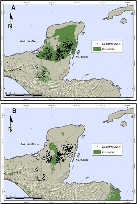 Obtención de datos. Los registros de presencia de Switenia macrophylla para México, se obtuvieron de la base de datos del Inventario Nacional Forestal y de Suelos (INFS) 2004-2009. Debido a que el área de interés fue primariamente la Península de Yucatán, se incluyeron presencias para la Península de Yucatán y los otros dos estados cercanos y con mayor número de presencias después de la Península: Chiapas y Tabasco. Las unidades de muestreo fueron conglomerados con 1,600 m2 de superficie separados a 5 × 5 km (CONAFOR, 2009). Una vez obtenidos los registros, se procedió a la limpieza de los datos que consistió en eliminar las coordenadas geográficas duplicadas, con la finalidad de obtener las coordenadas por conglomerado (la base de datos original incluye coordenadas por parcela muestreada, pero dada la cercanía entre parcelas, las coordenadas resultan duplicadas).