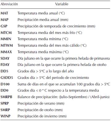 Se utilizaron 513 localidades de presencia y 17 variables climáticas que representan temperatura y precipitación promedio anual, temperaturas extremas mensuales, precipitación por períodos estacionales y el balance estacional de precipitación (Tabla 1). Estas variables han sido usadas previamente en el modelaje del hábitat climático propicio de especies forestales de México para Abies religiosa (Sáenz-Romero et al., 2012), Pinus chiapensis (Sáenz-Romero et al., 2010) y Pinus leiophylla (Sáenz-Romero et al., 2015). El modelo se construyó con el 75 % de los registros de ocurrencia. El umbral de convergencia manejado fue 0.00001 con 500 interacciones como límite máximo para cada corrida. El formato de salida analizado fue logístico, el cual indica un hábitat óptimo de 0 o 1, donde 0 es ausencia y 1 máxima idoneidad.