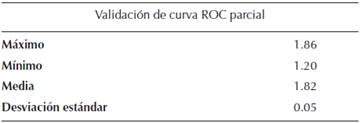 El modelo obtenido con el 75 % de los datos, se reclasificó con valores de 0 a 1, dónde 0 es menos idoneidad y 1 mayor idoneidad para la presencia de la especie. Posteriormente se obtuvo el área que ocupa cada clase de presencia de la especie para el 25 % de los datos. Una vez generados los archivos se introdujeron al programa ROC Parcial, con 1,000 interacciones y 0.95 de tolerancia de error de omisión. Una vez generados los resultados se obtuvo la media, máximos, mínimos y desviación estándar.