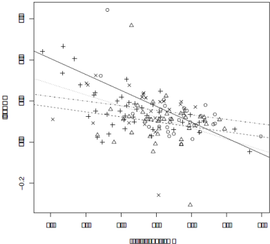 Figure 3 RGR with different initial dbh and different parasitizing species. Arceuthobium globosum: ▲ symbols and dashed line; A. vaginatum: × and dot-dash line; both species: ● and solid line; none: + and dotted line.