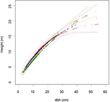Figure 4 Allometric relation between Pinus hartwegii dbh and height. Dashed lines represent confidence intervals for each curve; Arceuthobium globosum: blue; A. vaginatum: orange; both species: red; none: green.