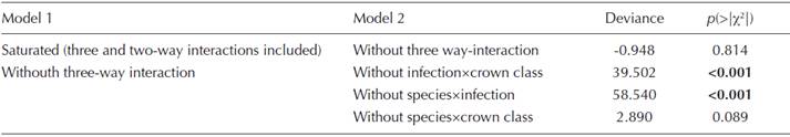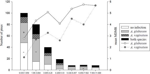 Figure 5 Number of pines on different crown classes (χ2 = 45.421, g.l. = 18, P < 0.001), parasitized by Arceuthobium globosum, A. vaginatum, both, or none (left axis), and mean MDMR of A. globosum and A. vaginatum in this same classes (right axis). (+) symbol indicates a frequency higher than expected, whereas (-) indicates a frequency lower than expected.