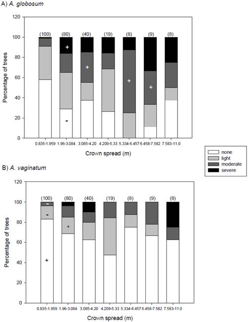 We tested which crown spread classes were more frequently infected; dbh and height classes were non-significant, hence the results are not reported. In addition, crown spread is a better descriptor for mistletoe presence because it represents the seed “landing” area. There is a significant association between crown spread and infection type (χ2 = 45.41, d.f. = 18, P = 0.0003), but only A. globosum showed a significant difference between the observed frequencies and that expected by chance in any crown spread size classes (Figure 5), where trees < 2 m are more frequently infected than those expected by this species and trees of 2-3 m and 6.4 and 7.5 had a lower frequency. On the other hand, it is worth to mention that the MDMR increased its magnitude with crown spread size (i.e., the wider the crown, the more severe the infection would be; Figure 5).