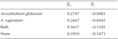 The parameters of the four fitted curves were tested against a null model where the data sets of each condition (none, both species, Arceuthobium globosum, or A. vaginatum) shared global parameters (i.e., a single curve for all the data), and tested with an extra sum of squares F test (Motulsky and Christopoulos, 2003) with Prism 6 (GraphPad Software, 2014).