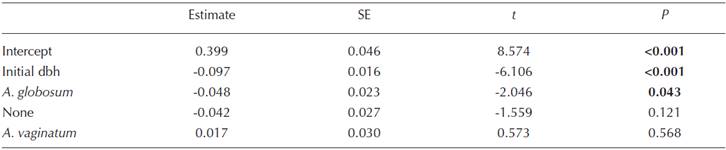 Table 2 Summary of the parameters of each level of the factor Species on RGR in the model RGR = β0 + β1dbh. No significant differences were found.