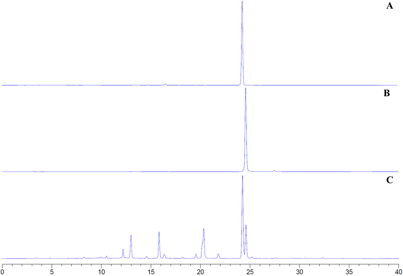 Figure 2 (A) HPLC-PDA profiling chromatogram of amarissinin A (1). (B) HPLC-PDA profiling chromatogram of 5,6-dihydroxy-7,3',4'-trimethoxyflavone (2). (C) HPLC-PDA profiling chromatogram of the acetone extract of Salvia urica at 330 nm.