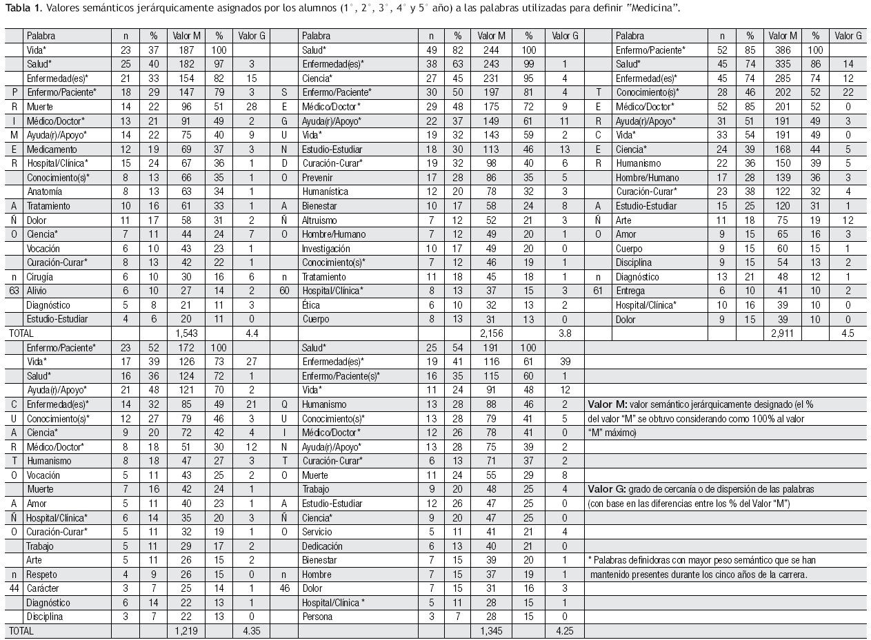 El Valor "G" calculado para los estudiantes en primer año fue de 4.4, en segundo 3.8, en tercero 4.5, en cuarto 4.35 y en quinto 4.25 (Tabla 1). Las definidoras en torno a las cuales los estudiantes construyen principalmente su concepto de "Medicina" son: en primer año, "vida" y "salud"; en segundo, "salud", "enfermedad", "ciencia", "paciente" y "doctor"; en tercero y cuarto, "paciente"; en quinto, "salud".