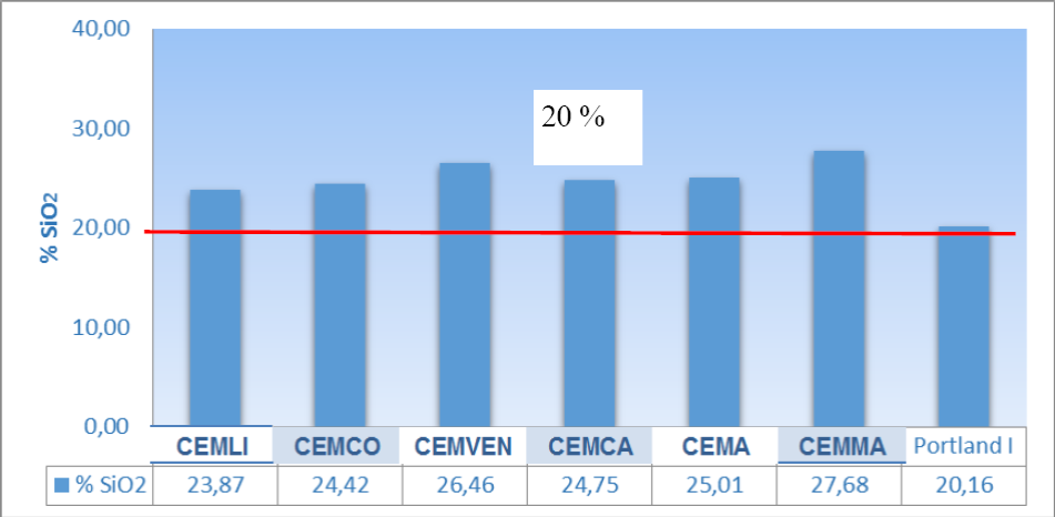 Os valores obtidos indicam que o cimento Portland I apresentou um valor de 20,16% e todas as outras amostras mais de 20% de dióxido de silício, que é o parâmetro adotado como mínimo pela norma COVENIN 28-93/ASTM C-150 para o cimento Portland tipo II, já que a norma não especifica a quantidade deste componente para os cimentos Portland Tipo I. Todos os valores se encontram num intervalo entre 20% e 30%, sendo o cimento Portland Tipo I o de menor porcentagem.