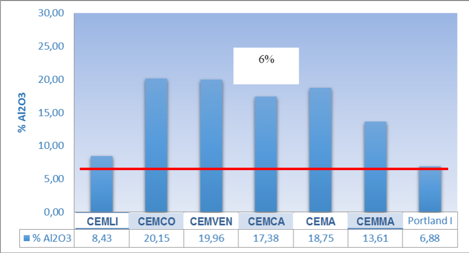 Além disso, a alta porcentagem de Al2O3 está relacionada com o baixo tempo de pega obtido nos diferentes cimentos compostos, devido a potencial formação de altas quantidades de C3A; o que também aumenta a susceptibilidade ao ataque de sulfato, o que é muito importante em construções em ambientes marinhos.