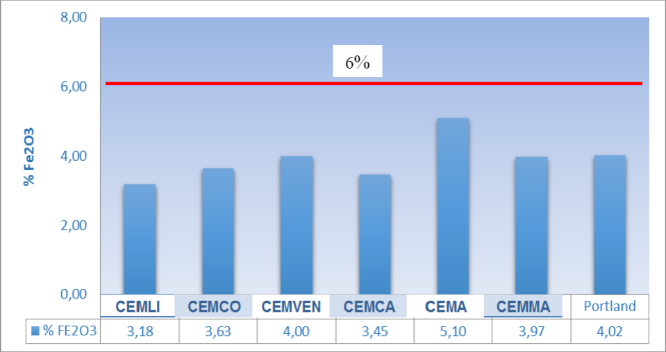 Óxido férrico (Fe 2 O 3 ): As porcentagens de óxido férrico para cada uma das amostras estudadas estão detalhadas na Figura 3. Todas as amostras analisadas se encontram abaixo do limite estabelecido na norma COVENIN 28-93/ASTM C-150, sendo a amostra de cimento CEMA a que apresentou a maior porcentagem de óxido férrico, 5,10%, e a amostra de cimento CEMLI a que apresentou a menor porcentagem deste componente, 3,18%.