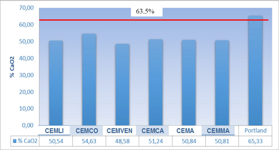 Este ensaio não possui um valor normalizado para comparação, entretanto Porrero (2004) indica valores entre 60% e 67% de CaO para cimentos Portland tipo I de excelente qualidade, estando os cimentos compostos avaliados abaixo destes valores, ente 48,58% e 54,63%.