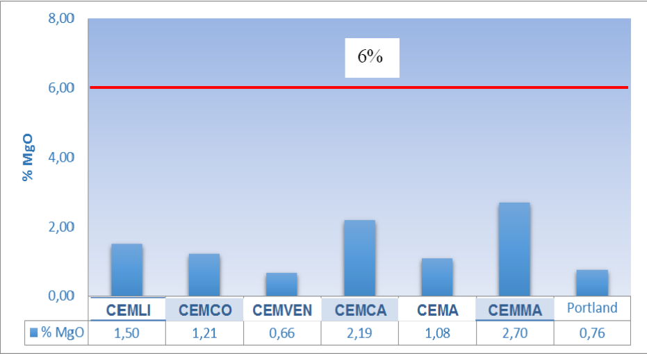 Todos os valores se encontram abaixo do limite de 6%, estabelecido na norma COVENIN 109-90/ASTM C-114. Observa-se que as porcentagens de Óxido de Magnésio estão compreendidas entre 0,66% para as amostras de CEMVEN e 2,7% para as amostras de CENMA.