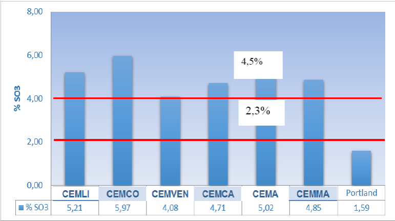 Os requisitos químicos estabelecidos na norma COVENIN 28-93/ASTM C-150 estipulam a porcentagem de Trióxido de Azufre presente nos cimentos tipo Portland como inferior a um intervalo entre 2,3% e 4,5%. A Figura 6 mostra que somente o CEMVEN (4,08%) e o Portland (1,59%) estão de acordo com esta norma, visto que as demais amostram apresentam maiores porcentagens, entre 4,85% e 5,97%.