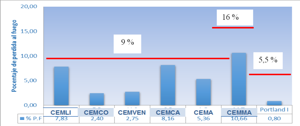 Todas as amostras analisadas atenderam aos parâmetros estabelecidos nas normas COVENIN. Para os cimentos CPCA1, os valores devem ser inferiores a 9%, para o CPCA2 inferiores a 16% e para os cimentos Portland tipo I inferiores a 5,5%. Os cimentos CEMLI e CEMCA, com 7,83% e 8,16%, respectivamente, apresentam as maiores porcentagens de PF em relação às demais amostras.