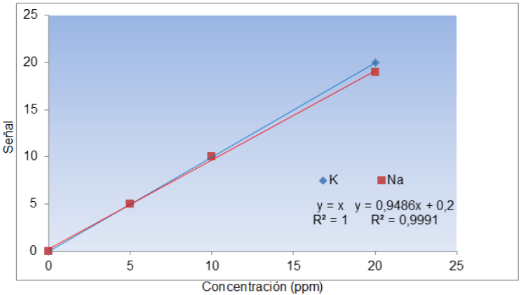 Como se observa na Figura 8, tanto o Na como o K apresentam um excelente comportamento linear. Os resultados obtidos (Tabela 4) para os valores limites das amostras indicam que todas as concentrações de Na estão abaixo do desvio máximo admitido, que é de 0,03%. Em relação ao K, 72% dos resultados se encontram abaixo de 0,03%, que é um valor aceitável, apenas CEMCO e CENMA estão em aparente desacordo, com uma porcentagem de 0,04%, mas também podem ser considerados como conformes com a norma.