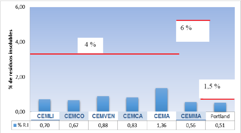 Com base nos resultados obtidos, observa-se que todas as amostras cumprem com os parâmetros estabelecidos nas normas COVENIN. Em termos de resíduos insolúveis, os cimentos CPCA1 apresentaram porcentagens inferiores a 4%, os CPCA2 porcentagens inferiores a 6% e o cimento Portland tipo I uma porcentagem inferior a 1,5%. Nos resultados pode-se observar que em sua maioria, a % de RI das amostras se encontram abaixo de 1%, com exceção do cimento CEMAN, o qual apresentou % levemente superior a 1%. Como todas as amostras foram comparadas com as normas COVENIN 3134-04/ASTM C-150, o cimento Portland também atendeu integralmente a todos estes parâmetros.