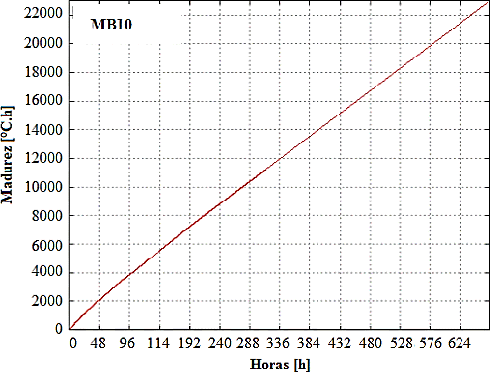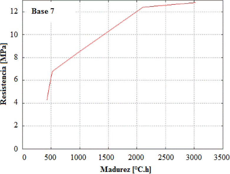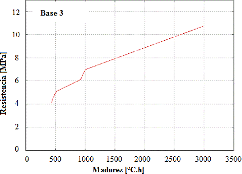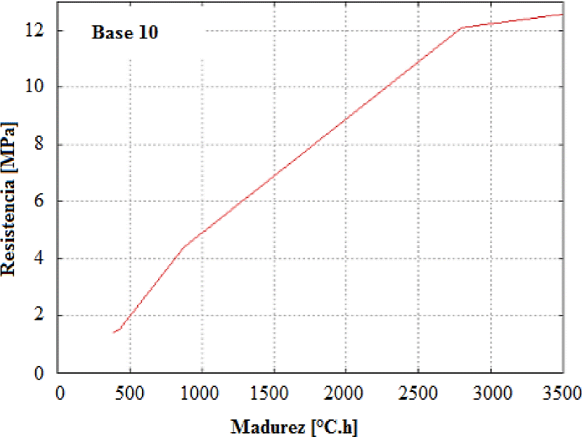 Se utilizó la formula de Nurse-Saul - Madurez (ºC.h) para las variables, tiempo, temperatura y resistencia. La Figura 5 muestra la relación tiempo vs. madurez para la base 10 (como ejemplo) y las Figuras 6, 7 y 8 la relación resistencia vs. madurez para las bases 3, 7 y 10.